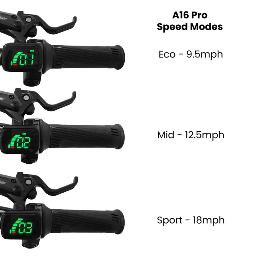 3 Speeds: 1 – Beginner (9km/h), 2 – Advanced (20km/h), 3 – Sport (30km/h)